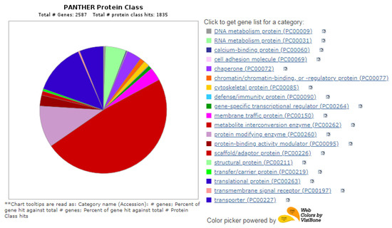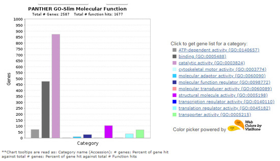 The functional characterization of identified proteins was based on Gene Ontology (GO) using the PANTHER 8.0 platform, which generated information regarding cellular localization and metabolic and biological processes. The classification of proteins was based on cellular components, molecular function, and biological processes (Figure 7, Figure 8, Figure 9, Figure 10 and Figure 11), and to cluster them, we exploited the K-means clustering approach of the web tool STRING (https://string-db.org/ 17 October 2023). The obtained results are shown in Figure 12a (more abundant proteins) and Figure 12b (less abundant proteins), and Figure 12c shows gene co-occurrence across genomes. Gene ontology protein classification in HBGH35 and Pusa Naveen (♀) classify DEPs based on their molecular function (Figure 7). Around 1677 molecular function hits were observed across 2587 genes. About 62% of the proteins were involved in a catalytic role (GO: 0003824), which includes antioxidative enzymes, molecular chaperons, osmoprotectants, sugars, antioxidants, etc., and 25% of the proteins belonged to the binding protein class (GO: 0005488), which includes proteins that regulate abiotic stress conditions, signal transduction pathways, and post-transcriptional processes such as splicing regulation, mRNA transport, and mRNA translation modulation. Other proteins involved in molecular function include those involved in molecular adaptor activity (GO: 0060090), molecular transducer activity (GO: 0060089), structural molecule activity (GO: 0005198), and transporter activity (GO: 0005215). After identifying the molecular functions of the DEPs, further analysis was performed to determine the protein classes for the proteins involved in molecular function.