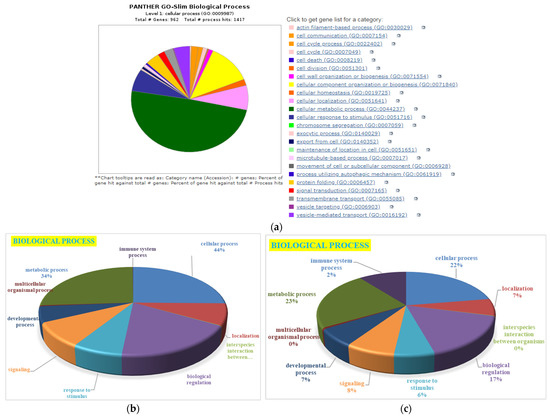 Gene Ontology classification of proteins with: (a) process hits, (b) HBGH35, and (c) Pusa Naveen (♀) based on their biological processes.