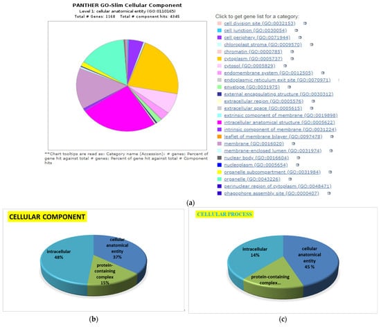Gene Ontology classification of proteins: (a) process hits, (b) HBGH35, and (c) Pusa Naveen (♀) based on their cellular level.