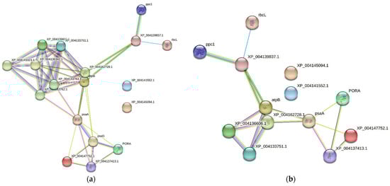 STRING analysis of (a) more abundant, (b) less abundant, and (c) gene co-occurrence patterns across genomes shows similarities.