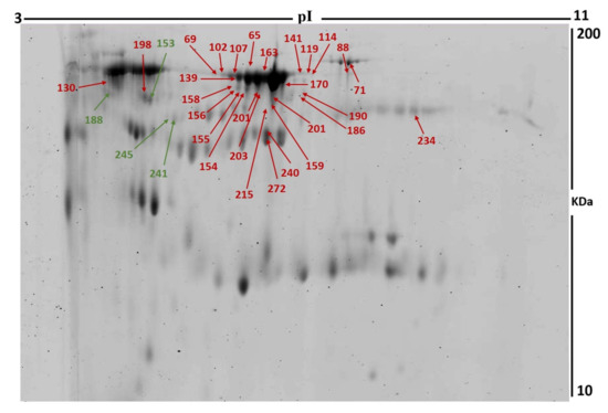 One-dimensional analytical gel electrophoresis was performed, followed by two-dimensional sodium dodecyl sulfate polyacrylamide gel electrophoresis (SDS-PAGE) on 12.5% fixed concentration gels, as previously described [20,21,22]. Briefly, 1 mg from the pool was added to the rehydration buffer (7 M urea, 2 M thiourea, 4% CHAPS, 0.006 g DTT, 2 µL bromophenol blue, 5 µL IPG buffer (pI 3–11), a protease inhibitor cocktail) and applied to IPG strips. Isoelectric focusing was performed on an Ettan IPGphor IEF Unit (GE Healthcare, 30 V, 12 h, 20 °C at 50 µA per strip). Furthermore, the strips were treated by equilibration buffer with 0.1 g DDT and 0.9 g Iodoacetamide, respectively. Next, standard SDS-PAGE was preformed using an Ettan DALTsix Vertical System (GE Healthcare). The gels were scanned with a Sapphire biomolecular imager (Azure Biosystems, Dublin, OH, USA) and digitalized with Sapphire capture system image analysis software (Azure Biosystems, Dublin, OH, USA).