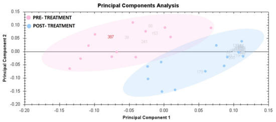 PCA was used to visualize each study group and detect outliers. Figure 3 displays the score plots for the two study groups. The samples were given group-specific colors. The PCA model demonstrating that the pre-treatment and post-treatment groups clustered in a two-dimensional score plot indicated that the proteomics profile was significantly different between the two groups. In Figure 3, the primary source of variance (PC1, explaining 60.95% of the variance) allows for separation of the pre-treatment group (red) and post-treatment group (blue).