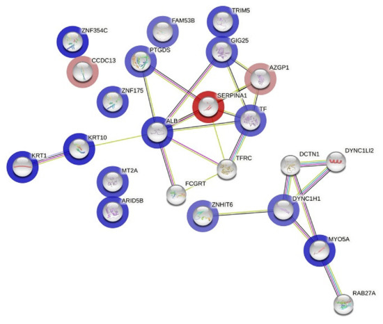 We searched for known and predicted interactions for the differentially expressed proteins identified by 2D-DIGE proteomics in the STRING protein–protein interaction database and constructed a protein–protein interaction network (Figure 4). We identified two networks, with 23 nodes and 25 edges. The network predicted an interaction between alpha-1-antitrypsin (SERPIN A1) and zinc-alpha-2-glycoprotein (ZAG), identified as being downregulated in the liraglutide post-treatment group, and serotransferrin and albumin, which were increased in our study. Biological process pathways identified in STRING for the 32 proteins included gene sets involved with vesicle-mediated transport (FDR < 0.00007), membrane trafficking (FDR < 0.00038), platelet degranulation (FDR < 0.0111), and the immune system (FDR < 0.0132). A second network predicted by STRING involved dynein chain proteins (DYNC1) and was involved in vasopressin-regulated water reabsorption (FDR < 0.007) (Table S3).