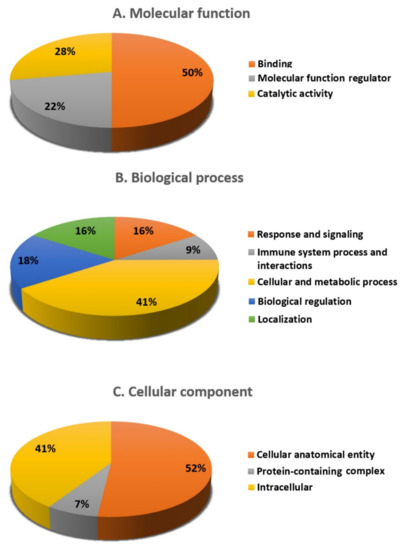 Comparative representation (%) of reported proteins divided into groups based on their cellular components (A), molecular functions (B), and biological processes (C).