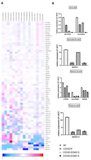 The transcriptomic analysis highlights different signatures of the B cell subpopulations among the subjects studied. In particular, the naïve cells of COVID-19-infected subjects showed downregulation of MT-ATP8 and HLA-DQA1. The first is a mitochondrial gene that encodes for an ATP synthase responsible for changing cellular energy capacity, increasing mitochondrial oxidative stress and/or modulating apoptosis []. Interestingly, we observed that its levels of expression were related to the severity of the disease. Indeed, the two COVID-19 patients receiving ECMO showed lower MT-ATP8 expression, close to zero, compared to the no-ECMO patient and the healthy control. The second is known to bind peptides derived from antigens that access the endocytic route of antigen-presenting cells (APC) and present them on the cell surface for recognition by the CD4 T-cells. In activated B cells, the ribosomal protein S4, Y-Linked 1 (RPS4Y1), described as being involved, together with HLA-DQA1, in a resistance to the treatment with corticosteroids combined with cyclosporin A, commonly used in autoimmune diseases, auto-inflammatory diseases, and transplant rejection [], was significantly downregulated. The memory B cell cluster showed downregulation of three genes: (1) FXYD, Domain-Containing Ion Transport Regulator 5, a glycoprotein that functions in the upregulation of chemokine production and is involved in the reduction of cell adhesion via its ability to downregulate E-cadherin; (2) HLA-DRB1, a beta chain of the antigen-presenting major histocompatibility complex class II (MHCII) molecule, known to guide antigen-specific T-helper effector functions, both in antibody-mediated immune responses and macrophage activation, to ultimately eliminate infectious agents and transformed cells [,,,,,,]; and (3) RPS20, ribosomal protein S20, for which downregulation contributes to a stress phenotype by suppressing genomic and cellular stability []. Plasma cell cluster profiling showed significant downregulation of an immunoglobulin heavy chain variable region, IGHV3-73, described as enabling antigen-binding activity and immunoglobulin receptor-binding activity and predicted to be involved in several processes, including activation of the immune response and the defense response to other organisms, as well as phagocytosis.