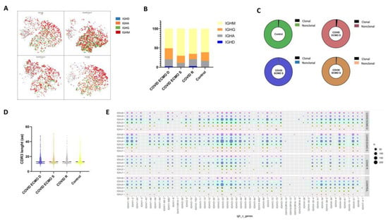(A) t-SNE plot of B cells colored by immunoglobulin heavy chain expression. (B) The proportion of different immunoglobulin isotypes in each sample. (C) The pie plot shows the proportion of clonally expanded B cells in the COVID ECMO S, COVID ECMO D, and COVID R patients and in the healthy control. (D) The distribution of immunoglobulin heavy chain (IGH) CDR3 length. (E) The bubble chart shows the usage frequency of V–J gene combination in each sample.