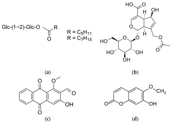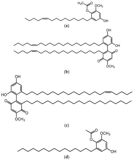 Chemical structure of cytotoxic alkylresorcinols from M. pumilum. 1-O-methyl-6-acetoxy-5-(pentadec-10Z-enyl)resorcinol (a), labisiaquinone A (b), labisiaquinone B (c), and 1-O-methyl-6-acetoxy-5-pentadecylresorcinol (d).