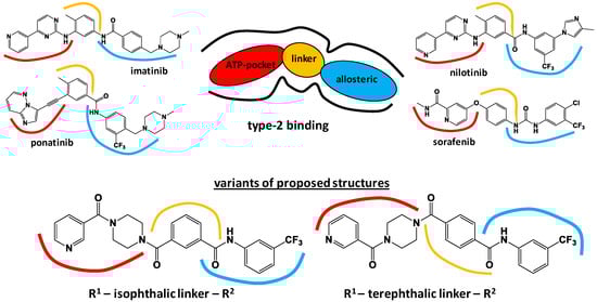 As shown in our previous work [31,32], the structure of a typical type-2 protein kinase inhibitor can be decomposed into three main fragments (Figure 1). Since the reengineering of imatinib into nilotinib, 3-(trifluoromethyl)aniline has emerged as the best choice for handling a kinase’s allosteric site. While type-2 inhibitors use various heterocyclic systems to mimic ATP interactions in the ATP-binding site, the linker is responsible for the spatial orientation of the inhibitor’s ATP and allosteric fragments. Taking these considerations into account, we proposed examining various linkers attached to the 3-(trifluoromethyl)aniline moiety as a rational strategy towards the development of novel chemical scaffolds that are able to target protein kinases. As part of this approach, we used 4-methylbenzamide linker to develop promising anticancer agents [31,32]. In the present study, we propose using isophthalic and terephthalic linkers as a framework for constructing novel type-2 inhibitors. Compared to 4-methylbenzamide, these phthalic linkers have some advantages. Firstly, they are more rigid, which can render inhibitor positioning more restrained and stable. Secondly, a non-allosteric amide bond may be involved in hydrogen bonding in the ATP pocket, resulting in additional interactions.