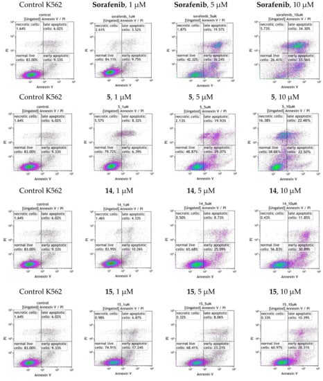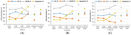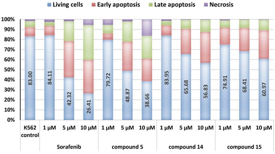 As shown above, compounds 5, 14 and 15 had significant antiproliferative activities, which is why their influences on the cell cycle and apoptosis level were determined, with the aim of understanding whether these effects are cytostatic or cytotoxic. In the cell cycle experiments, K562 cells were used. The cells were treated for 48 h with 1 µM, 5 µM and 10 µM concentrations of compounds 5, 14 and 15, as well as lapatinib and sorafenib, respectively. For the determination of changes in the distribution of cells in the phases of the cell cycle, the widely employed method of staining the cells with propidium iodide was used [39]. The results are shown in Table 4 and Figure 2.