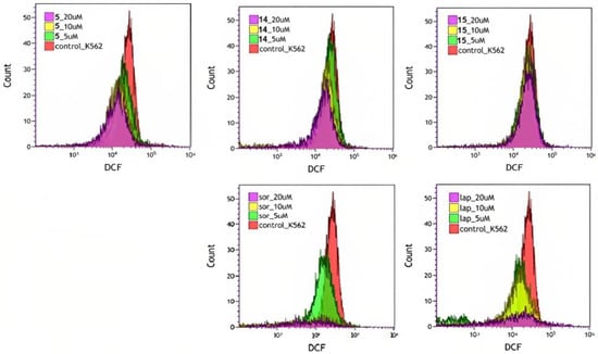 The redox status was assessed using the K562 cell line. A total of 400,000 of cells per well were seeded on a 6-well plate and treated with compounds 5, 14 and 15, as well as lapatinib and sorafenib, at concentrations of 5, 10, and 20 μM in duplicate for 48 h. After treatment, staining was performed with a 10 µM concentration of 2′,7′-dichlorodihydrofluorescein diacetate (Acros Organics, Somerville, NJ, USA) for 30 min at 37 °C in the dark. Then, the cells were washed to remove the 2′,7′-dichlorodihydrofluorescein diacetate by centrifugation at 1000 rpm for 5 min. The measurements were conducted using a Cytomics FC500 Beckman Coulter flow cytometer (FL1 channel for DCF).