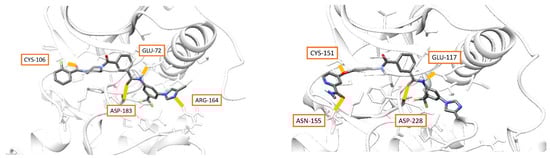 Binding models of 14 (left, PDB id: 3wze) and 11 (right, PDB id: 4asd) to VEGFR, predicted using molecular modeling. Hydrogen bonds are shown as orange lines [50].