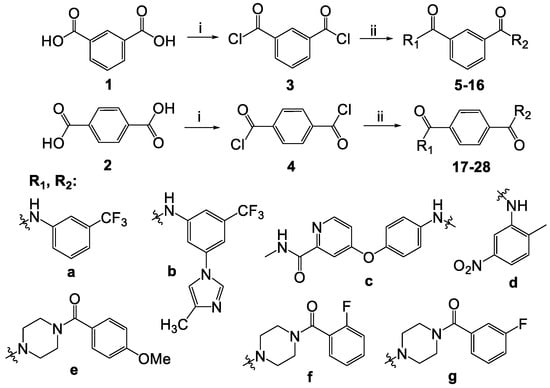 It should be noted that phthalic linkers with adjacent 1,2-carbonyl groups were not considered as a good choice, since they would not provide the optimal angle between the ATP and allosteric pharmacophoric groups of the potential inhibitors. In this context, both isophthalic and terephthalic linkers seemed to be rational choices, as they have more structural similarity with the known inhibitors.