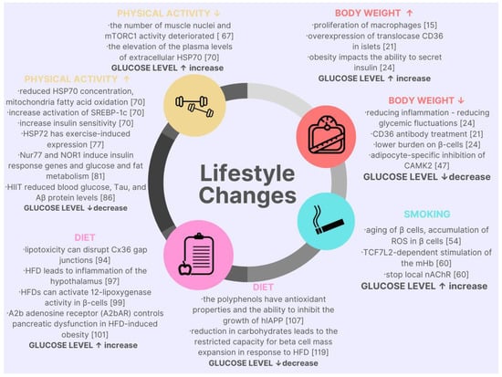 The factors affecting glucose fluctuations can be divided into modifiable and unmodifiable. Many modifiable factors influence increases and decreases in blood glucose levels, which is positive information for clinicians dealing with T2DM [7]. In this review, the most important factors to focus on are diet, body mass, smoking, and physical activity. The available literature shows that they play a significant role in cell changes in people with impaired glycemia. A summary of this section presents in Table 1.