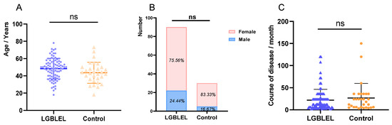 Comparative analysis images of general conditions of patients in LGBLEL group and control group. (A) Comparative analysis chart of age; (B) Comparative analysis chart of gender; (C) Comparative analysis chart of course of disease. “ns” refers to no statistically significant difference (p > 0.05).