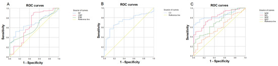 ROC curves of different effective indicators. (A) ROC curves of RF, CRP, and ESR; (B) ROC curve of C3; (C) ROC curves of IgG4, IgG, IgG2, and IgG1.