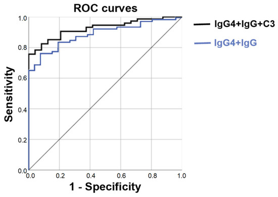 ROC curves of different prediction models. The black line represents the ROC curve of IgG4+IgG+C3 (AUC = 0.926), and the blue line represents the ROC curve of IgG4+IgG (AUC = 0.892).