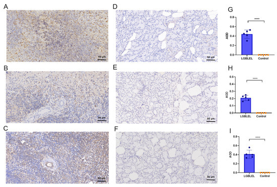 Since the AUC of IgG4+IgG+C3 in peripheral blood was the largest, IgG4, IgG, and C3 are usually more easily enriched in diseased tissues than in peripheral blood, we further performed IHC staining with anti-IgG4, anti-IgG and anti-C3 antibodies in the lacrimal-gland tissues of patients with LGBLEL and primary lacrimal prolapse to validate the different expressions of these biomarkers. As shown in Figure 4A–F, the IHC staining of IgG4, IgG, and C3 in the LGBLEL patients’ lacrimal-gland tissues revealed extensive positive expressions, whereas it displayed negative expressions in patients with primary lacrimal-gland prolapse. The quantitative findings indicated statistically significant differences between the two groups by ImageJ (n = 5, p < 0.0001; Figure 4G–I).