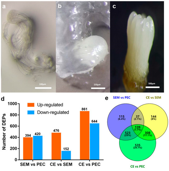 Images of three stages of SE. (a) primary embryogenic callus; (b) single embryo; (c) cotyledon embryo. DEPs in different comparison groups in SE. (d) Number of DEPs with up-regulated and down-regulated expression; (e) Venn diagram showing the distribution of DEPs shared and unique to the three comparison groups: SEM vs. PEC (blue circle), CE vs. SEM (yellow circle), and CE vs. PEC (green circle).