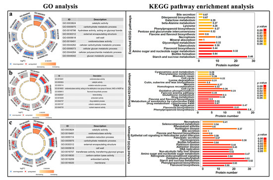 DEPs in the SEM vs. PEC comparison group were mostly enriched in the “catalytic activity” pathway (Figure 2a). DEPs in this comparison group were also enriched in the following pathways: the “carbohydrate metabolic process” pathway, which is involved in cell primary metabolism; the “cell wall” pathway, which is involved in the synthesis of cell structures; and the “transferase activity” and “hydrolase activity” pathways, which are involved in secondary metabolism. DEPs in the CE vs. SEM comparison group were enriched in oxidoreductase activity pathways (Figure 2b). DEPs in the CE vs. PEC comparison group were enriched in catalytically active pathways, and the DEPs involved in primary metabolism, secondary metabolism, and cell structure in the CE vs. PEC comparison group were similar to the DEPs in the PEC vs. SEM comparison group (Figure 2c). DEPs enriched in various pathways in the CE vs. SEM comparison group were also observed in the CE vs. PEC comparison group, especially DEPs involved in stress resistance.