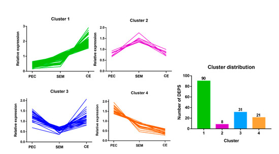 Hierarchical cluster analysis of DEPs. DEPs in PEC, SEM, and CE were classified into four clusters according to their expression patterns.