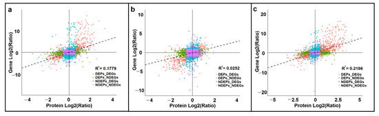 Correlations in the expression levels of proteins and associated transcripts for the (a) SEM vs. PEC, (b) CE vs. SEM, and (c) CE vs. PEC comparison groups. DEPs: differentially expressed proteins; DEGs: differentially expressed genes; NDEPs: no differentially expressed proteins; NDEGs: no differentially expressed genes.