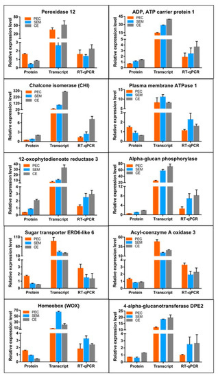 To verify that the expression levels of messenger RNAs (mRNAs) and DEPs were consistent, 10 candidate DEPs involved in growth and development processes in SE in L. olgensis were analyzed using RT-qPCR. Expression levels of proteins and their corresponding mRNAs were similar for the following proteins: peroxidase 12, CHI, 12-oxophytodienoate reductase 3, sugar transporter ERD6-like 6, ADP, ATP carrier protein 1, alpha-glucan phosphorylase, and acyl-coenzyme A oxidase 3 (Figure 5). However, levels of protein and mRNA expression were inconsistent for the following proteins: WOX, plasma membrane ATPase 1, and 4-alpha-glucanotransferase DPE2 (Figure 5).