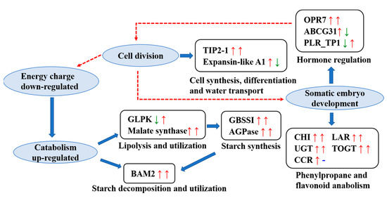 The key signaling pathways and proteins involved in SE in L. olgensis. The first arrow behind each protein represents its expression from PEC to SEM, and the second arrow represents its expression from SEM to CE. Up arrows indicate significant up-regulation; down arrows indicate significant down-regulation; and blue horizontal lines indicate neither up-regulation nor down-regulation. Dotted red lines indicate indirect action.