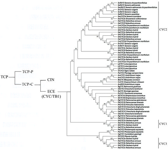 - Howarth, D.G.; Donoghue, M.J. Phylogenetic analysis of the “ECE” (CYC/TB1) clade reveals duplications predating the core eudicots. Proc. Natl. Acad. Sci. USA 2006, 103, 9101–9106. [Google Scholar] [CrossRef] [PubMed]