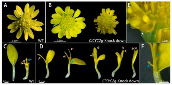 - Liu, H.; Sun, M.; Pan, H.; Cheng, T.; Wang, J.; Zhang, Q. Two Cyc2CL transcripts (Cyc2CL-1 and Cyc2CL-2) may play key roles in the petal and stamen development of ray florets in chrysanthemum. BMC Plant Biol. 2021, 21, 105. [Google Scholar] [CrossRef]