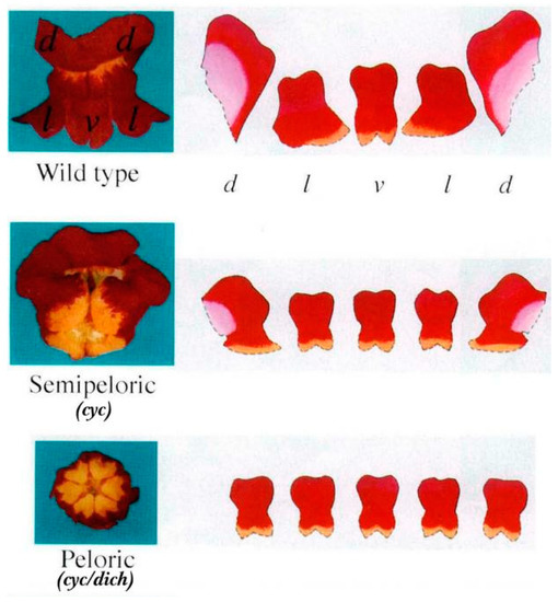 - Coen, E.; Nugent, J.; Luo, D.; Bradley, D.; Cubas, P.; Chadwick, M.; Copsey, L.; Carpenter, R. Evolution of floral symmetry. Philos. Trans. R. Soc. B 1995, 350, 35–38. [Google Scholar] [CrossRef]