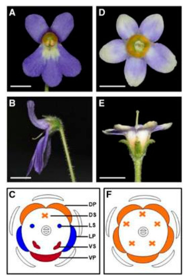 - Preston, J.C.; Hileman, L.C. Developmental genetics of floral symmetry evolution. Trends Plant Sci. 2009, 14, 147–154. [Google Scholar] [CrossRef]