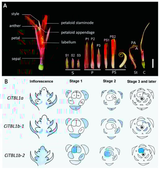 - Lucibelli, F.; Valoroso, M.; Theißen, G.; Nolden, S.; Mondragon Palomino, M.; Aceto, S. Extending the toolkit for beauty: Differential co-expression of DROOPING LEAF-like and class B MADS-Box genes during Phalaenopsis flower development. Int. J. Mol. Sci. 2021, 22, 7025. [Google Scholar] [CrossRef] [PubMed]