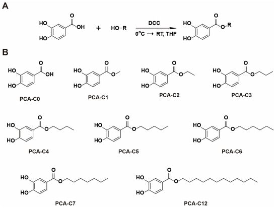 Molecular structures of PCA derivatives. (A) Synthetic procedure for alkyl ester derivatives of PCA. (B) A series of PCA derivatives: PCA-C0–C7 and C12.