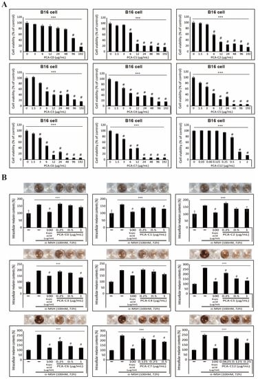 PCA derivatives inhibit α-MSH-induced melanin synthesis in B16 melanoma cells. (A) Cell viability results showed the inhibition of B16 cell proliferation after treatment with an increased PCA-C(X) concentration for 24 h. The data represent three independent tests. # p < 0.001 versus control. *** p < 0.001 (ANOVA test). (B) Intracellular melanin contents were determined using cultured media containing secreted melanin after α-MSH or/and PCA-C(X) treatment for 72 h. The results of extracellular melanin content can be found in Table S1. The pictures show the color of the culture medium, and the melanin content was reduced by PCA-C(X). The data are representative of three independent experiments. # p < 0.001 versus control. *** p < 0.001 (ANOVA test).