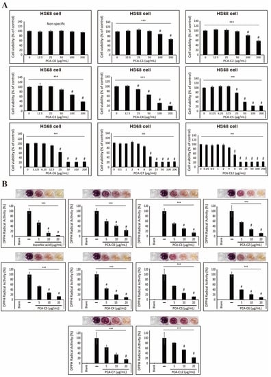 PCA derivatives have an antioxidant effect on HS68 fibroblast cells. (A) The inhibition of HS68 cell proliferation after treatment with an increased PCA-C(X) concentration for 24 h was shown by cell viability. The data represent three independent tests. # p < 0.001 versus control. *** p < 0.001 (ANOVA test). (B) The antioxidant effect of the PCA derivatives was confirmed by measuring DPPH radical activity. The pictures show that the color of the culture medium was reduced by PCA-C(X). The data are representative of three independent experiments. # p < 0.001 versus control. *** p < 0.001 (ANOVA test).