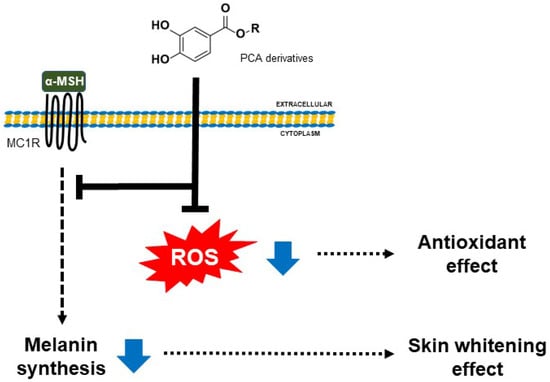 A simple scheme of anti-melanogenesis and antioxidant effects exerted by PCA derivatives. The anti-whitening effect of PCA derivatives is mediated by inhibiting the melanin synthesis induced via α-melanocyte-stimulating hormone (α-MSH) in B16 melanoma cells. In addition, PCA derivatives have a more effective antioxidant effect than PCA in HS68 fibroblast cells. We suggest that PCA derivatives might have multiple effects for other needs.