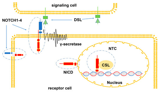 The NOTCH signaling pathway is composed of NOTCH ligand, NOTCH receptor, related enzymes, transcription factor CSL, regulatory factor, and NOTCH signaling downstream molecules [18]. NOTCH ligands, namely Delta/Serrate/Lag2 (DSL) family, belong to one-way transmembrane proteins. Mammals have five DSL ligands: Dll1, Dll4, and Dll3 are members of the delta-like ligand family; Jag1 and Jag2 are members of the serrate ligand family [18]. The NOTCH receptors, a series of transmembrane glycoproteins, are composed of extracellular regions, transmembrane regions, and cytoplasmic regions [19]. The NOTCH receptors (NOTCH1-4), encoded by different genes, differ in structures and can be degraded by a variety of proteases [19]. The cleaved NOTCH intracellular domain (NICD) is released into the cytoplasm and then transported to the nucleus to form the NOTCH transcription complex (NTC), which is composed of NICD, DNA binding factor, and transcriptional coactivators [19]. After combining with NOTCH regulatory element (NRE), NTC recruits transcription co-regulatory factors and starts the transcription of the specific target genes (such as Hes1, Hes5, etc.) [19]. The signaling cascade of the NOTCH pathway often begins with the interaction between the NOTCH receptor and the DSL ligand [19]. DSL ligands activate specific NOTCH receptors and induce their cleavage. Then NOTCH intracellular domain (NICD) is released and transported to the nucleus, thus forming NOTCH transcription complex (NTC) with transcription factor CSL, which acts as a transcription coactivator to start the transcription of NOTCH target genes [19] (Figure 1).
