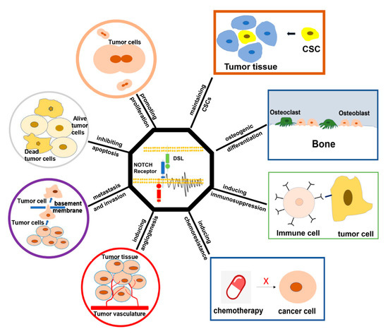 Cancer stem cells (CSCs), a cancer cell type with static function and strong self-renewal ability, are located in the primary tumor tissue niche [41]. The existence of CSCs is closely related to chemotherapy resistance, relapse, and metastasis of various cancers [42,43]. NOTCH signaling is associated with the sustained self-renewal ability of CSCs in several malignancies [44,45]. A study found that inhibition of NOTCH1 signaling significantly restrained the growth of CSCs in osteosarcoma [46,47]. Exosomes from human umbilical vein endothelial cells promoted the self-renewal of CSCs in osteosarcoma by enhancing the expression of NOTCH1, Hes1, and Hey1 while blocking NOTCH signaling reversed the positive effect on the CSCs [48]. In addition, studies have reported that the activation of NOTCH1 signaling induced by cisplatin promoted the activity of CSCs in osteosarcoma in vitro, including increasing the number of Stro-1+/CD117+ double-positive cells and spheroid formation capacity [49]. In contrast, inhibiting NOTCH signaling could eliminate these characteristics and decrease the enrichment of osteosarcoma stem cells [49]. In conclusion, the abnormal activation of NOTCH1 signaling exerts a profound effect on the self-renewal of CSCs in osteosarcoma.