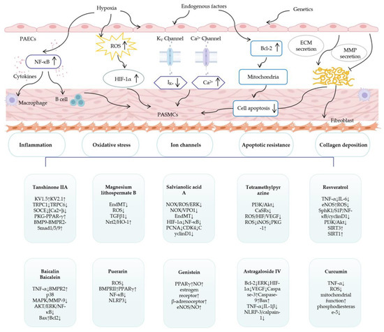 | Sodium tanshinone II sulfonate A | Salvia miltiorrhiza Bung | HPH rats | 10 mg/kg, 30 mg/kg, 3 weeks | + | + | + | IL-6↓IL-8↓TNF-α↓PI3K/AKT/mTOR↓ [38] | Clinical trial Phase 3 | Anti-inflammatory |