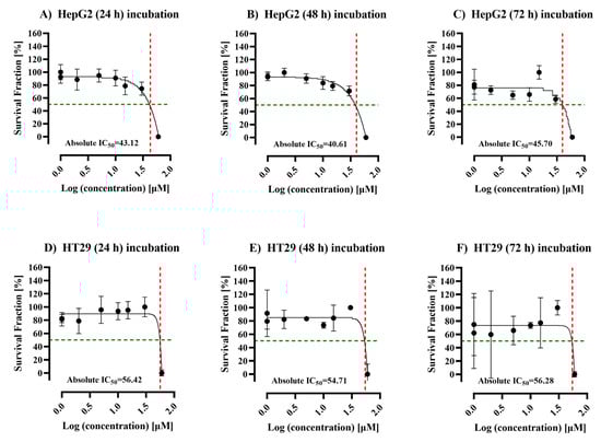 Dose–response curve in HepG2, and HT29 cells after treatment with acetyl-L-carnitine (ALC) at 24, 48, and 72 h. (A–C) HepG2 cell line, (D–F) HT29 cell line. Both cell lines were treated with 0, 0.5, 5, 10, 15, 30, and 60 μM/mL at 24, 48, 72 h. The viability was measured at different time points for each cell line. The point where the red dashed line meets the green dashed line is the absolute IC50. The concentration was transformed to log concentration and normalized to percentage, then the mean of six repeats was plotted by nonlinear regression. The error bars correspond to standard deviation (SD).