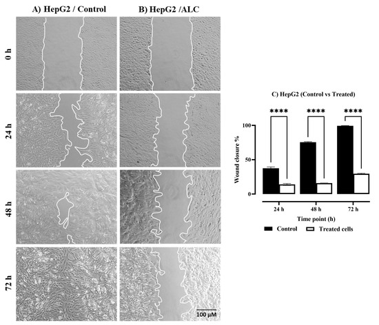 The percentage of wound closure was determined after exposing each cell line to ALC at their IC50 at 0, 24, 48, and 72 h. The results in Figure 2A,B showed that treatment with ALC affected the ability of the HepG2 cell line to close the wound after all three tested time points (24, 48, and 72 h) when compared with the control (untreated cells). The HepG2 cell line (Figure 2C) showed a significant reduction when treated with ALC when compared to control cells (p < 0.0001). The results in Figure 3A,B clearly show the effect of ALC on the capability of the HT29 cells to migrate and close the wound. Similarly, HT29 cells showed a significant reduction in wound healing compared to control cells (Figure 3C) with p < 0.0001.
