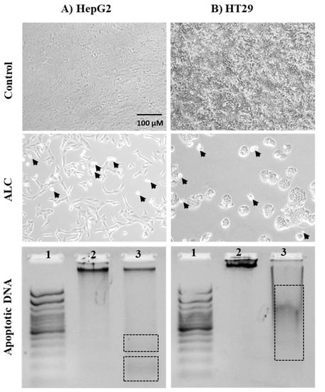 An Apoptosis DNA Ladder Assay Kit (abcam, Cambridge, UK) was used to detect internucleosomal DNA fragmentation in apoptotic cells according to manufacturing protocol. Cells from different cell lines were seeded in 6-well plates at a density of 10 × 105 cells/well for 24 h at 37 °C in a humidified 5% CO2 environment. After 24 h, the existing media were replaced with serum-free media and incubated for another 24 h. Each cell line was treated with ALC at their IC50 and incubated for 48 h. Untreated cells were used as controls. Cells were trypsinized then pelleted in a 1.5 mL tube, washed with PBS, and pelleted by centrifugation for 5 min at 500× g. The supernatant was carefully removed, and cells were lysed with 35 μL of a lysis buffer with gentle pipetting. Then, 5 μL of Enzyme A solution was added to each sample and mixed by gentle vortexing, and cells were incubated at 37 °C for 10 min. Thereafter, 5 μL of Enzyme B solution was added to each sample and incubated at 50 °C for 30 min, followed by the addition of 5 μL of ammonium acetate solution. Then, 50 μL of isopropanol was added, and the solution was mixed well and placed at −20 °C for 10 min. Samples were centrifuged for 10 min, the supernatant was removed, and the DNA pellet was washed with 0.5 mL 70% ethanol and air dried for 10 min. The DNA pellets were dissolved in 30 μL of suspension buffer, and 20 μL from each sample was electrophoresed on 1.5% agarose gel stained with 0.5 μg/mL ethidium bromide.