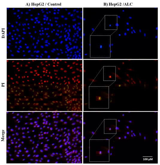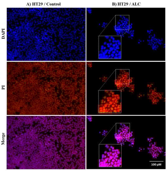 Cells from different cell lines were seeded in 96-well plates at a density of 0.5 × 105 cells/well for 24 h at 37 °C in a humidified 5% CO2 atmosphere. After 24 h, the media were removed and serum-free media were added to each well and incubated for 24 h. Cells were then treated with ALC at their IC50 and, after 48 h, the media were removed and the cells were washed twice with PBS, fixed with methanol, and left to air dry at 25 °C for 30 min. The cells were then stained with a 500 nM solution of propidium iodide (PI; Invitrogen) in PBS for 5 min and then rinsed several times in PBS. DAPI (4′,6′-diamidino-2-phenylindole; Life Technologies, Carlsbad, CA, USA) was used to stain cells at a concentration of 1 µg/mL in PBS to detect nuclear morphological changes. The cells were incubated for 5 min in the dark and then rinsed several times with PBS. Cell images were captured using an inverted fluorescent microscope (Leica, Wetzlar, Germany) with appropriate filters for PI and DAPI. ImageJ software was used to overlay the images.