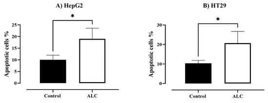 Apoptotic cells (%) under fluorescent microscopy in HepG2 and HT29 cells after ALC treatment compared to control. (A) HpG2 cells, (B) HT29 cells. The proportion of apoptotic cells in each cell line after the treatments were determined using inverted fluorescence microscopy. An unpaired t-test analysis was used to compare the apoptotic % between treated and control in each cell line. Data expressed as means ± SE of three experiments * p < 0.05 compared to control.