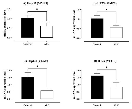 To determine the effect of ALC on HepG2 and HT29 cells, the mRNA expression levels of MMP9 and VEGF were determined. The results obtained in Figure 8A,C show a significant decrease in mRNA expression levels of MMPs and VEGF in both cell lines treated with ALC (p < 0.05) compared with the control.