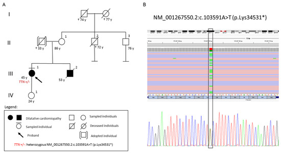(A) Pedigree of the family showing the phenotypes of the affected relatives and the genotype of the proband. Male is represented by a square; female is represented by a circle. (B) Multi-gene panel analysis. NGS and Sanger sequencing of the proband showing the c.103591A > T (p.Lys34531*) in TTN on genomic DNA. The identified pathogenic variant in TTN is visualized by Integrative Genome Viewer (IGV) software. Ref Seq (Reference sequencing) used for variant annotation: NM_001267550.2.