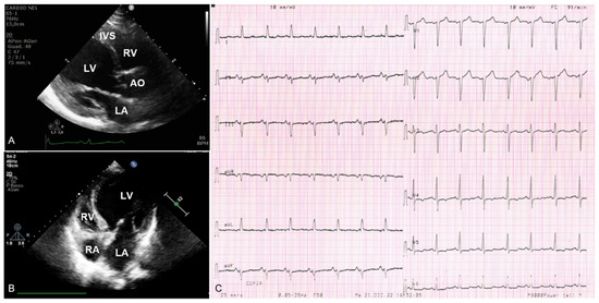 Echocardiographic and electrocardiographic images of the proband (III:1). (A) Two-dimensional transthoracic echocardiogram diastolic frames of parasternal long-axis view and (B) 4-chamber view showing dilated and globular-shaped left ventricle, with septal thinning. (C) Electrocardiogram showing left anterior hemiblock and slight ST segment depression from V4 to V6. LV—left ventricle; RV—right ventricle; LA—left atrium; RA—right atrium; AO—aorta; IVS—interventricular septum.