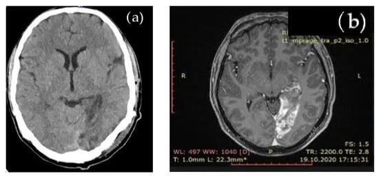 Cerebral imaging: (a) native brain CT aspect: left occipital ischemic hypodense lesion; (b) brain MRI aspect: left occipital ischemia.