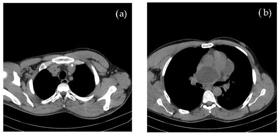 Concomitant onset of limb and cerebral ischemia was suggestive of a common etiology, most probable of cardiac origin. The CT evaluation of the thorax and mediastinum was further performed to investigate the cause of suddenly occurring dyspnea, revealing multiple round, thin-walled lesions, with fluid content (cystic), located both mediastinal and pericardial, suggestive for hydatid cysts; a well-defined cystic formation of 69 mm in diameter appeared on the projection area of the left atrium. Around the postero-superior and apex of the heart, adjacent to the pericardium, three cystic lesions of 80/43/96 mm were identified. In the lower paratracheal region (Barety space level), a cystic formation of 30/26/24 mm was also visible. No other thoraco-abdominal pathological images were detected, as shown in Figure 2.