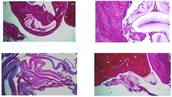 Although it used to be an endemic disease in some areas, its general incidence has been increasing in the last four decades, due to transcontinental population migration. Generally, a single cyst forms (60–80% of cases), but there are cases presenting multiple cysts located in virtually any organ of the human body [1]. Clinical features are related to the localization and level of infection, not necessarily manifesting in all patients, as there are cases with long asymptomatic evolution. Symptoms mainly result from pressure effects caused by the enlarging cysts or are consequences of their rupture: hypersensitivity/anaphylaxis, organ insufficiency or functional disturbances, obstruction of the biliary ducts and kidneys, bronchi, or cerebrospinal fluid drainage pathways with the appearance of acute hydrocephalus. Multi-organ dissemination involves hepatic, pulmonary, cerebral and cardiac lesions, with long term consequences [1,2,3,4,5,6,7].